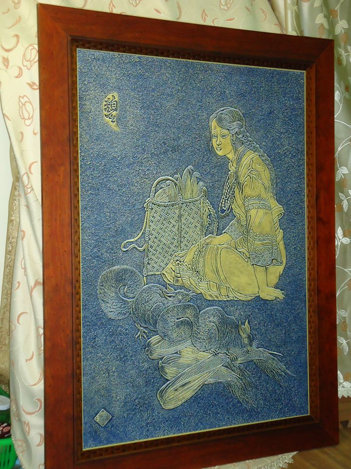 石铜雕画作品-休憩中的农家女